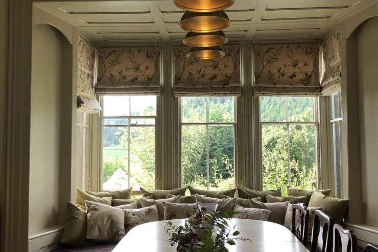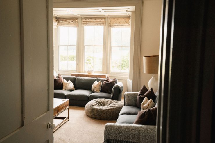 A grand sitting room with large windows overlooking the front garden — perfect for gathering together. Light the log fire, sink into the sofas or bean bags, and enjoy the collection of games and books ready for cosy evenings in.